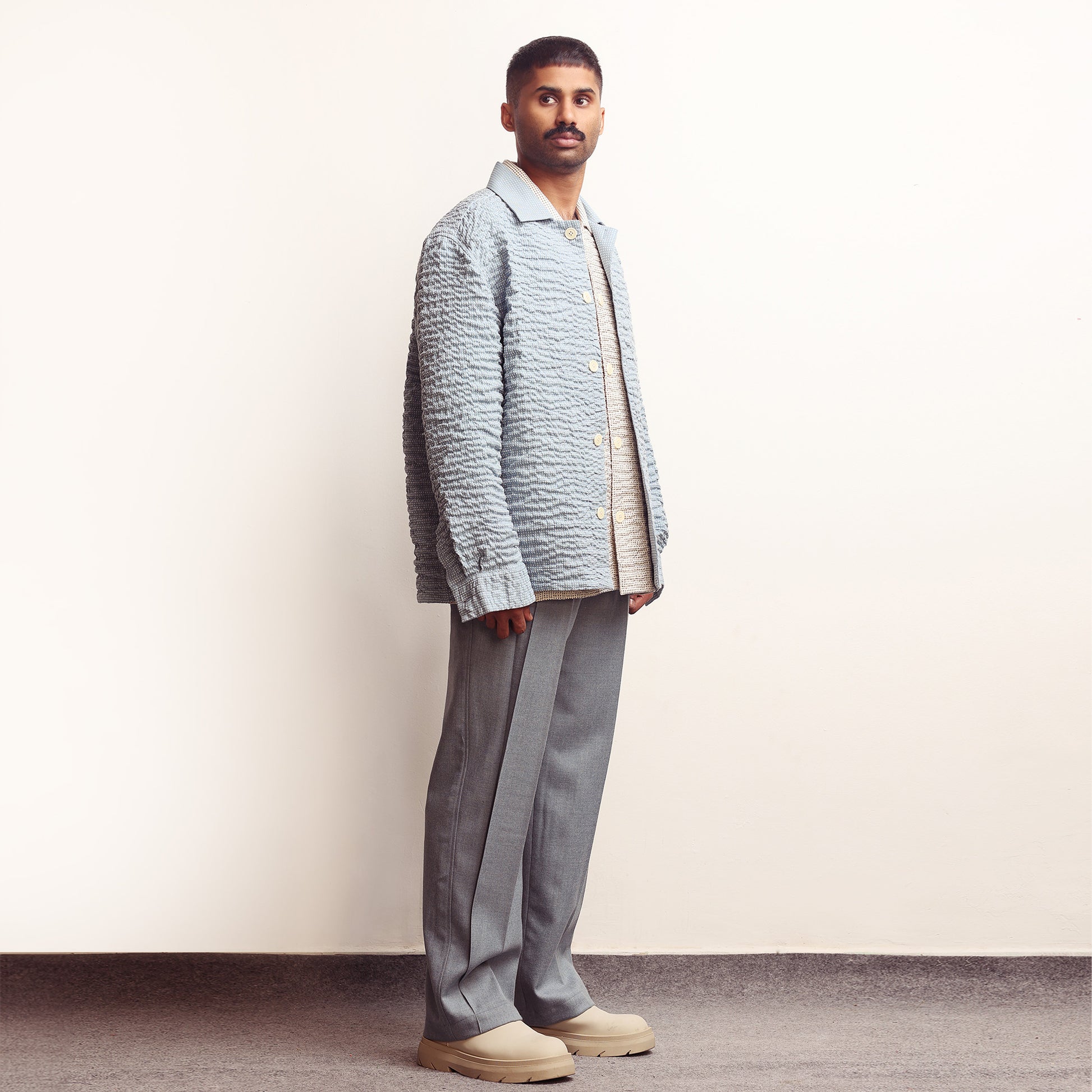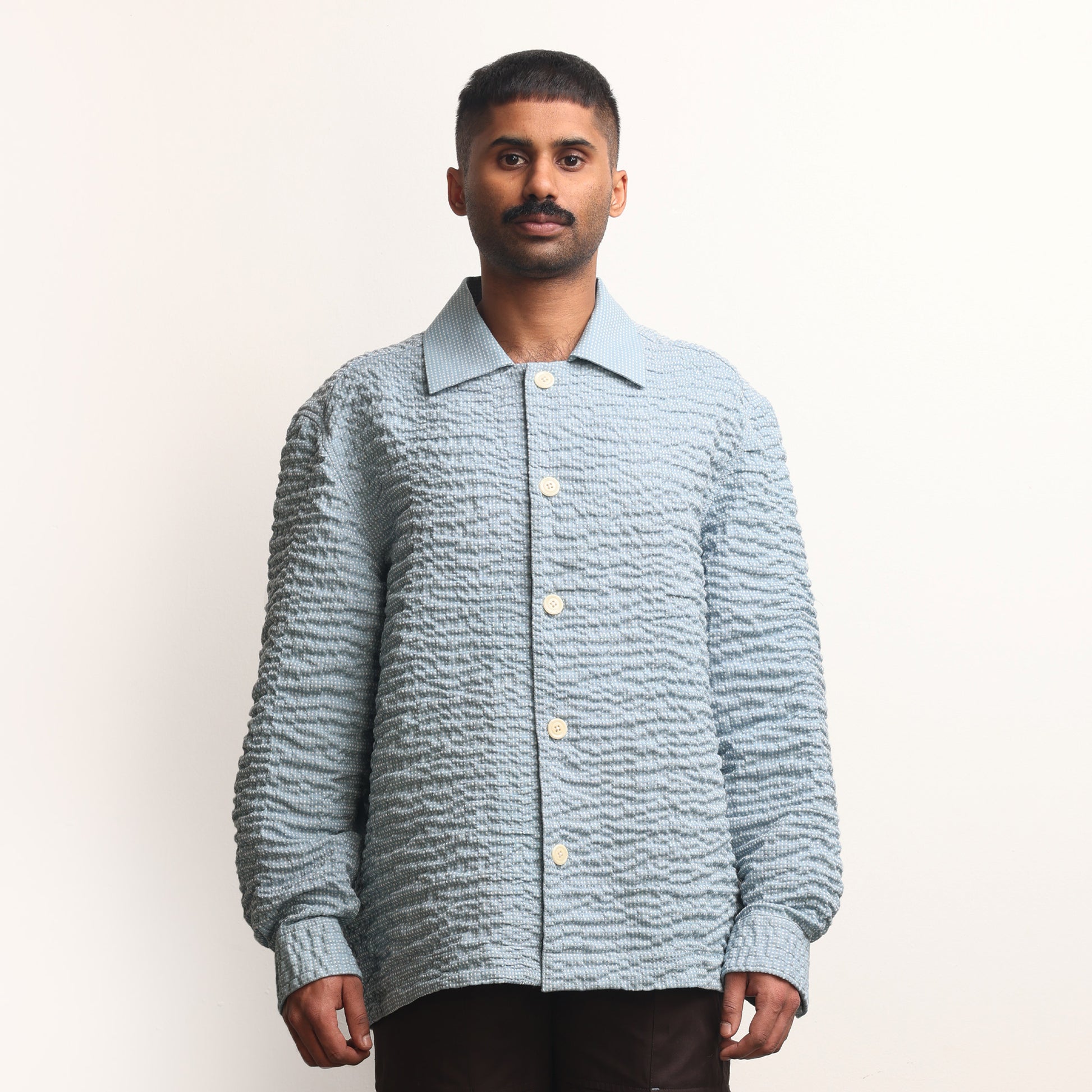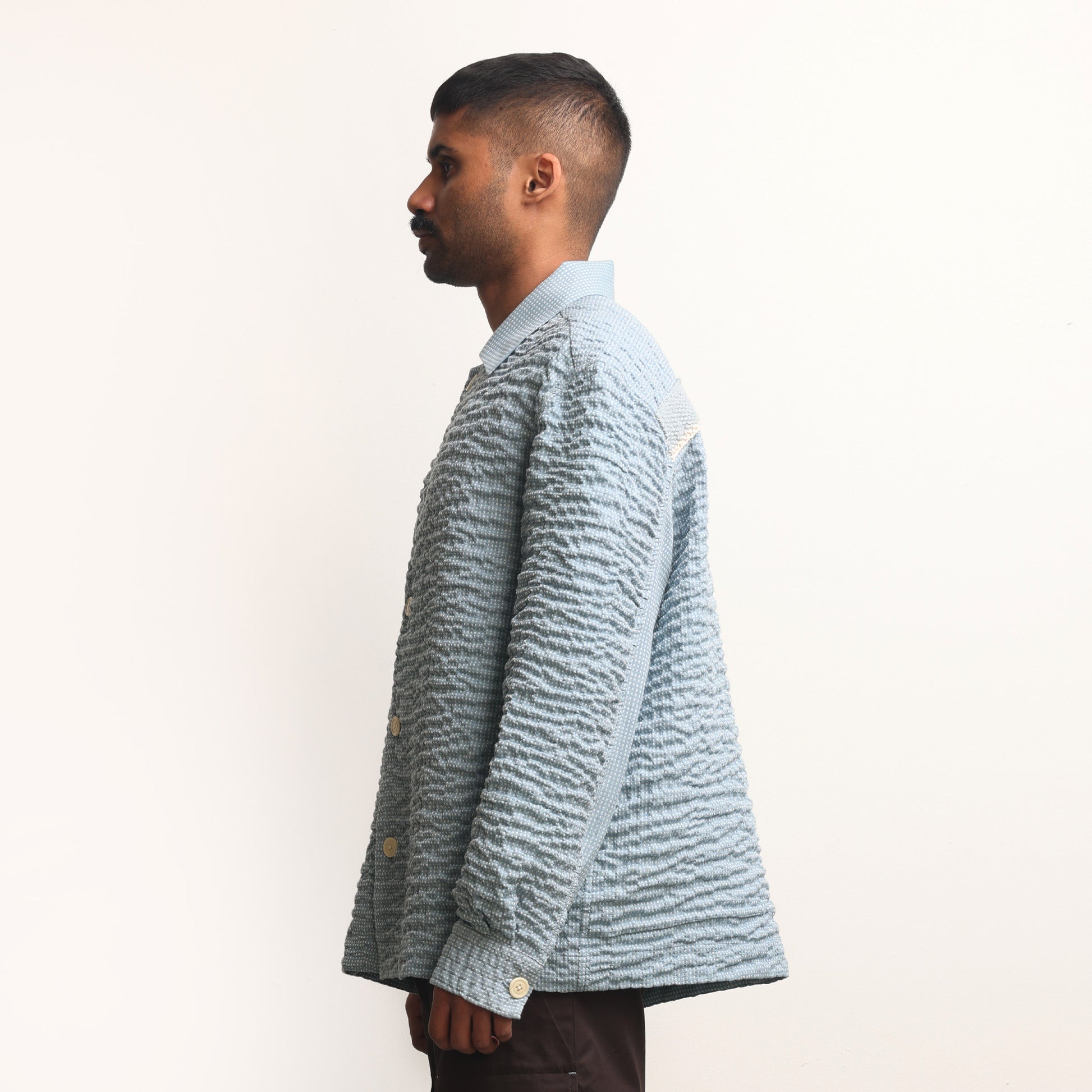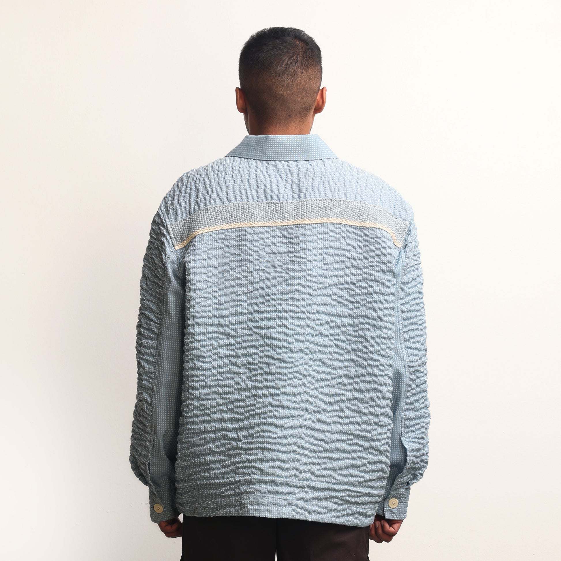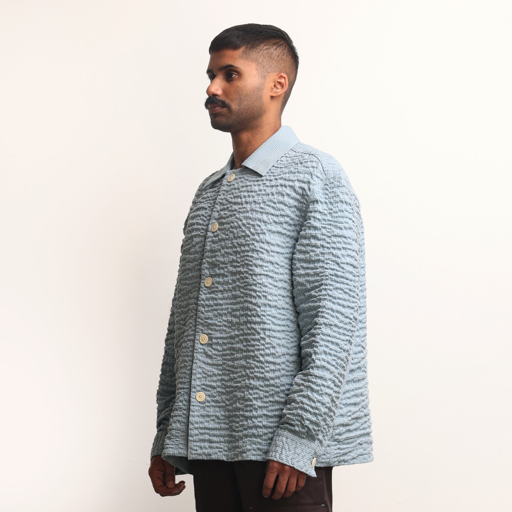 Hand-wrinkled surface all over, Oversized fit, Corozo buttons, Continuous sleeve placket.