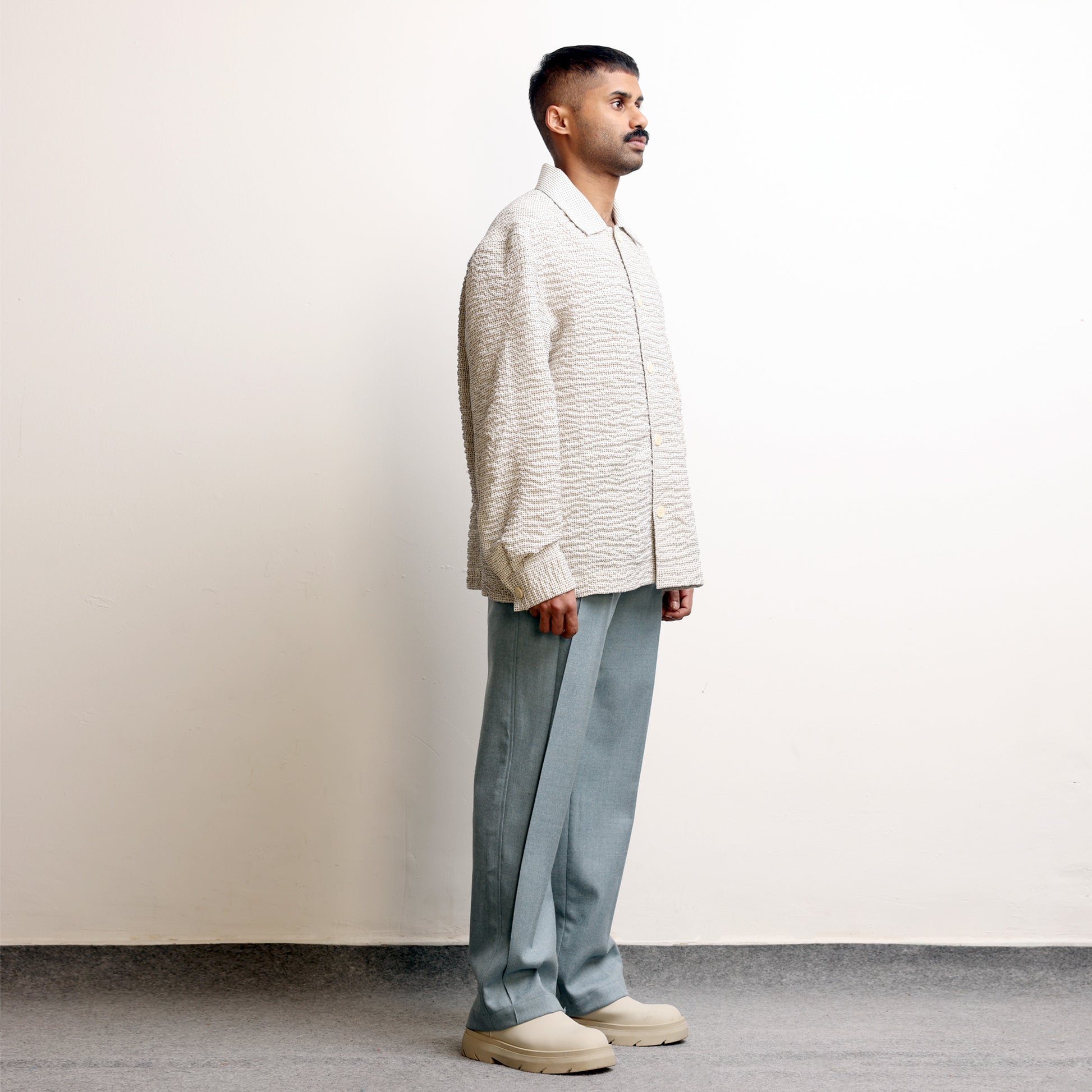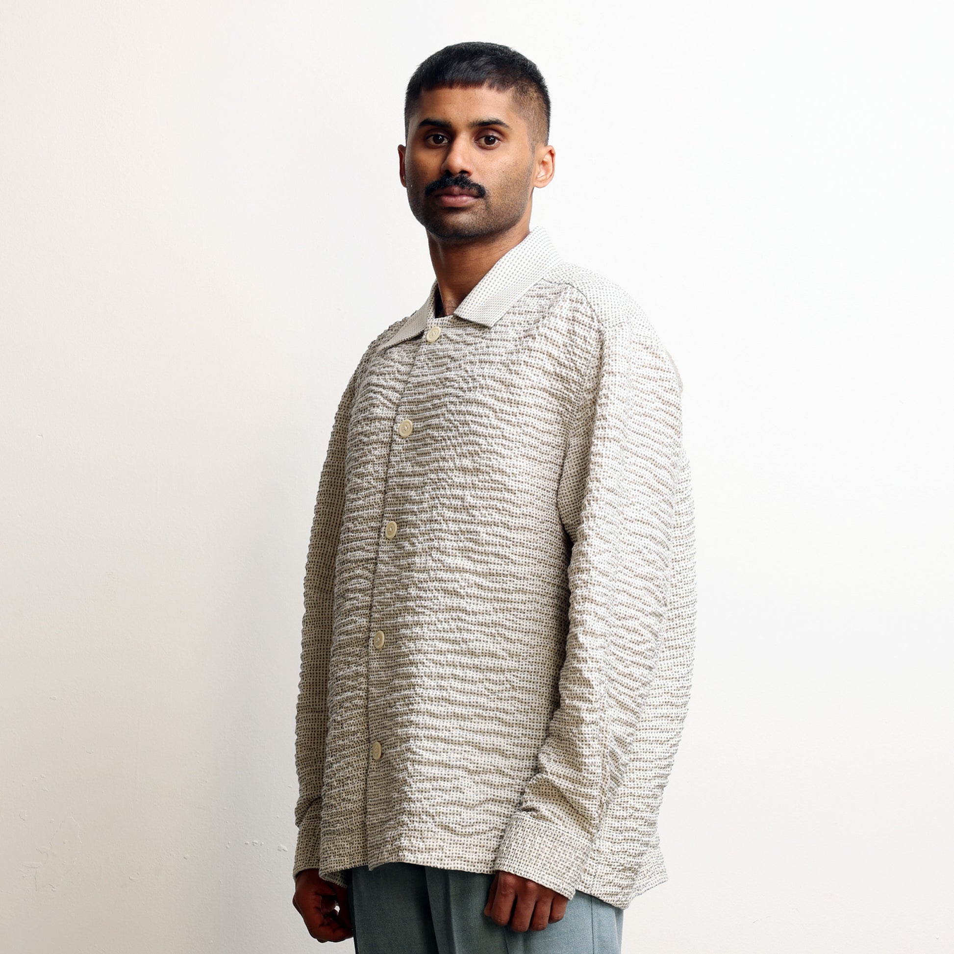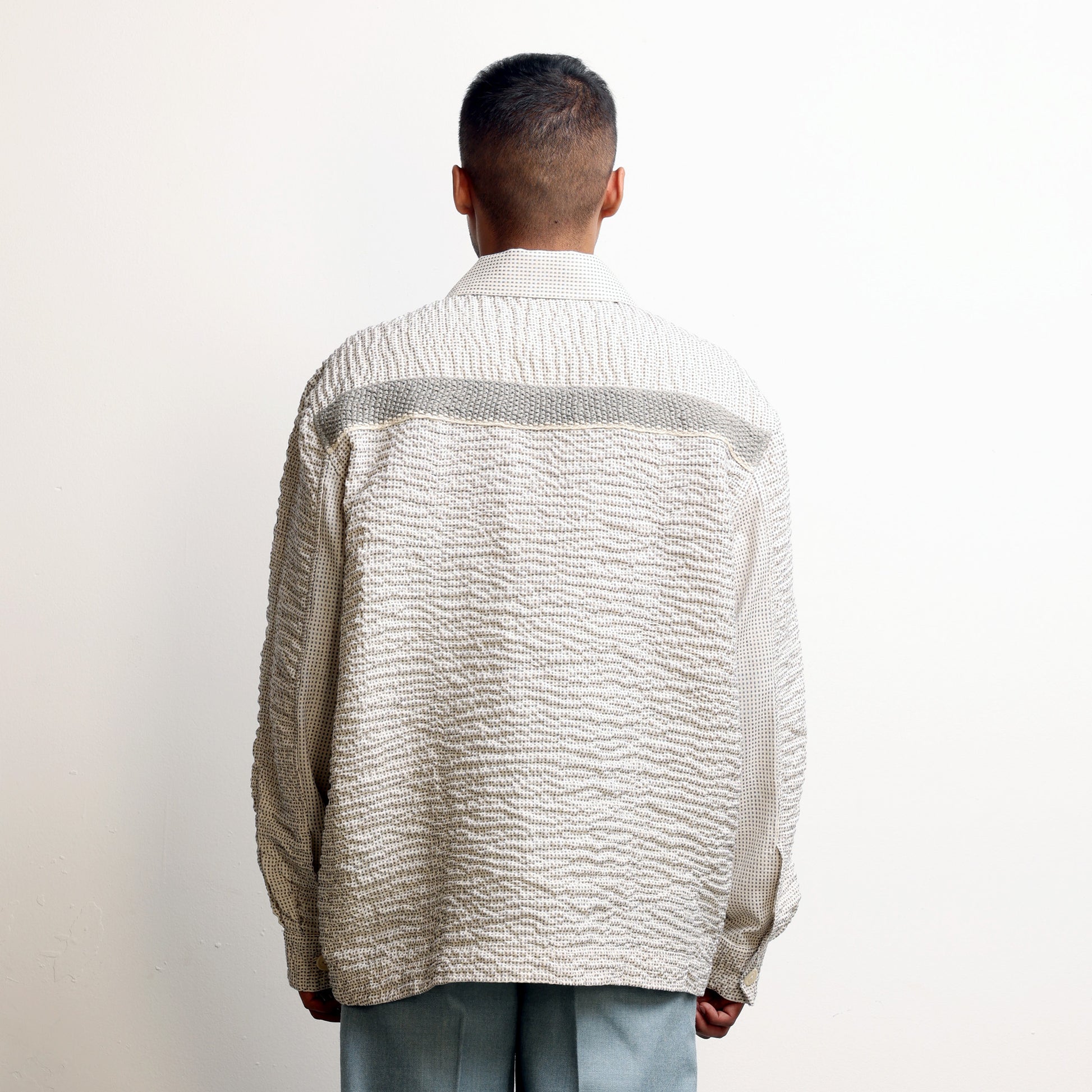 Hand-wrinkled surface all over, Oversized fit, Corozo buttons, Continuous sleeve placket.