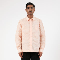 The Actin Wrinkled Shirt in Salmon features hand-stitched wrinkles on striped fabric, giving it a unique texture and a no-iron finish. Made from 100% cotton, it combines comfort with craftsmanship. Designed with an Oxford collar, Corozo buttons, and full sleeves for a refined yet relaxed look.