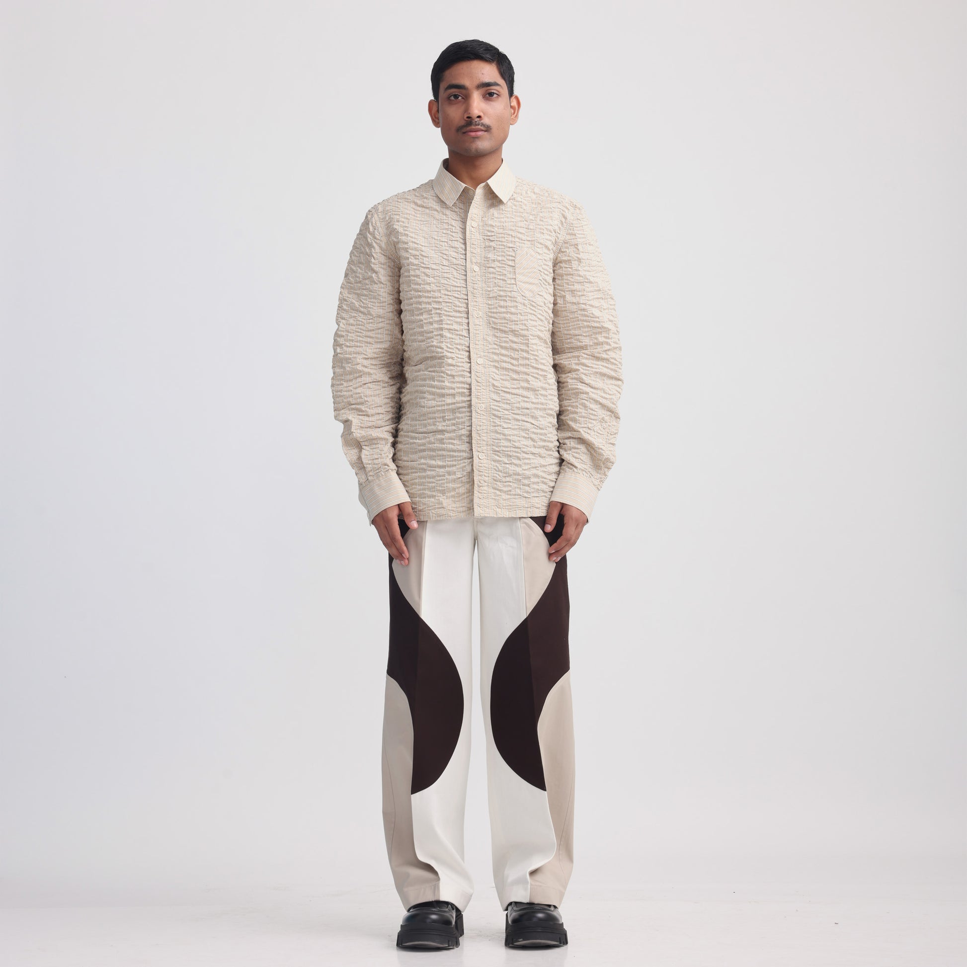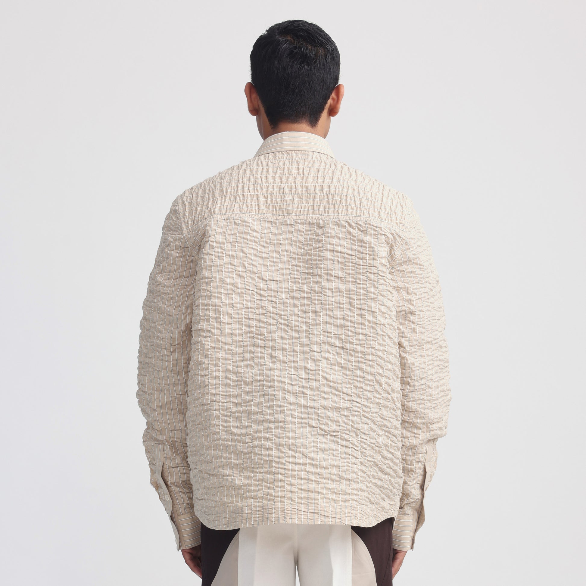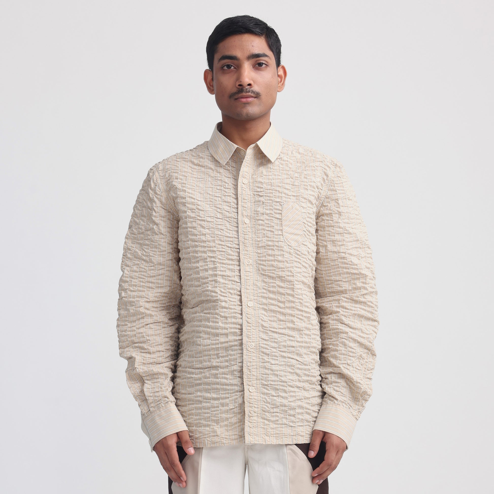 Hand-stitched wrinkles on stripe fabric all over, Oxford collar, Corozo buttons