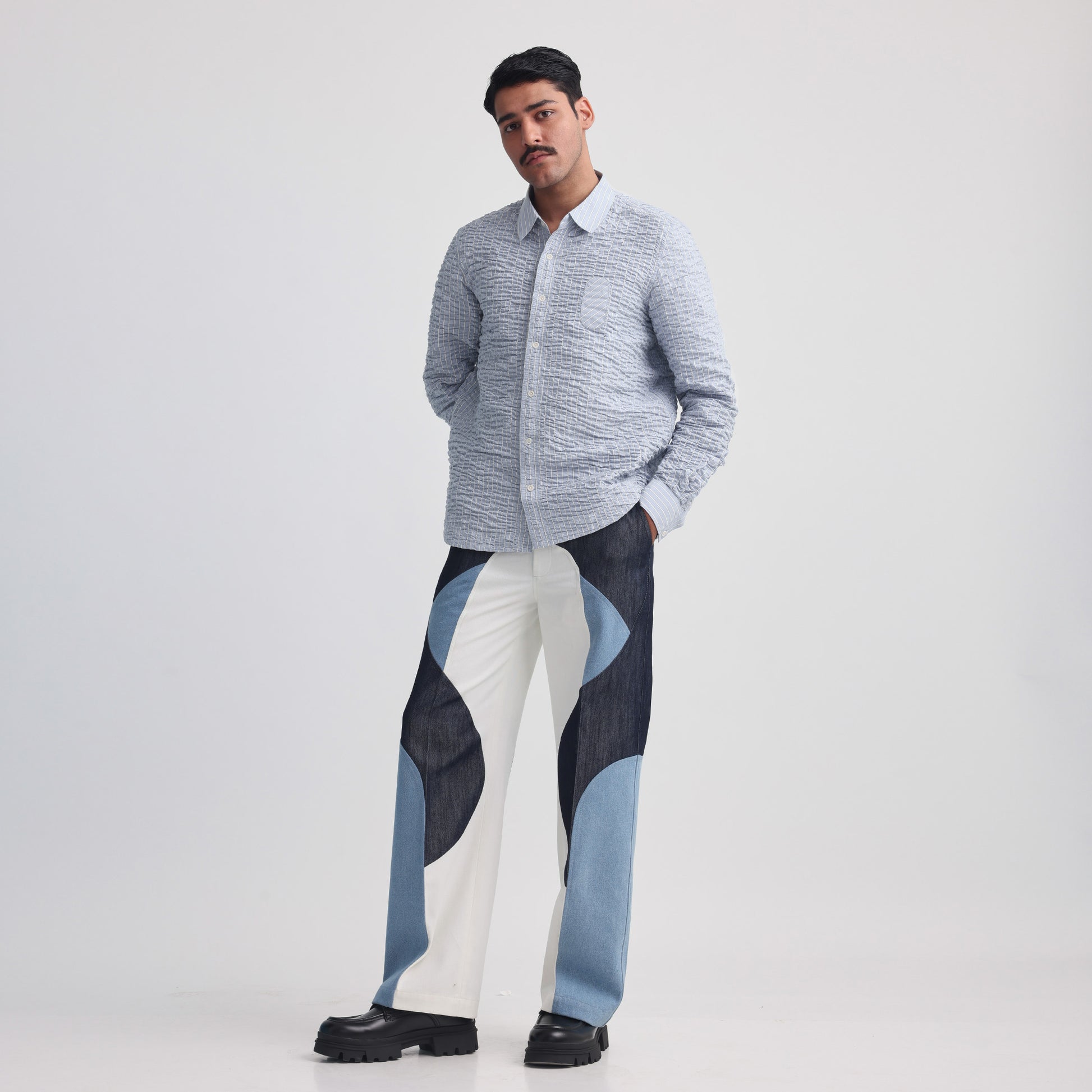 Hand-stitched wrinkles on stripe fabric all over, Oxford collar, Corozo buttons