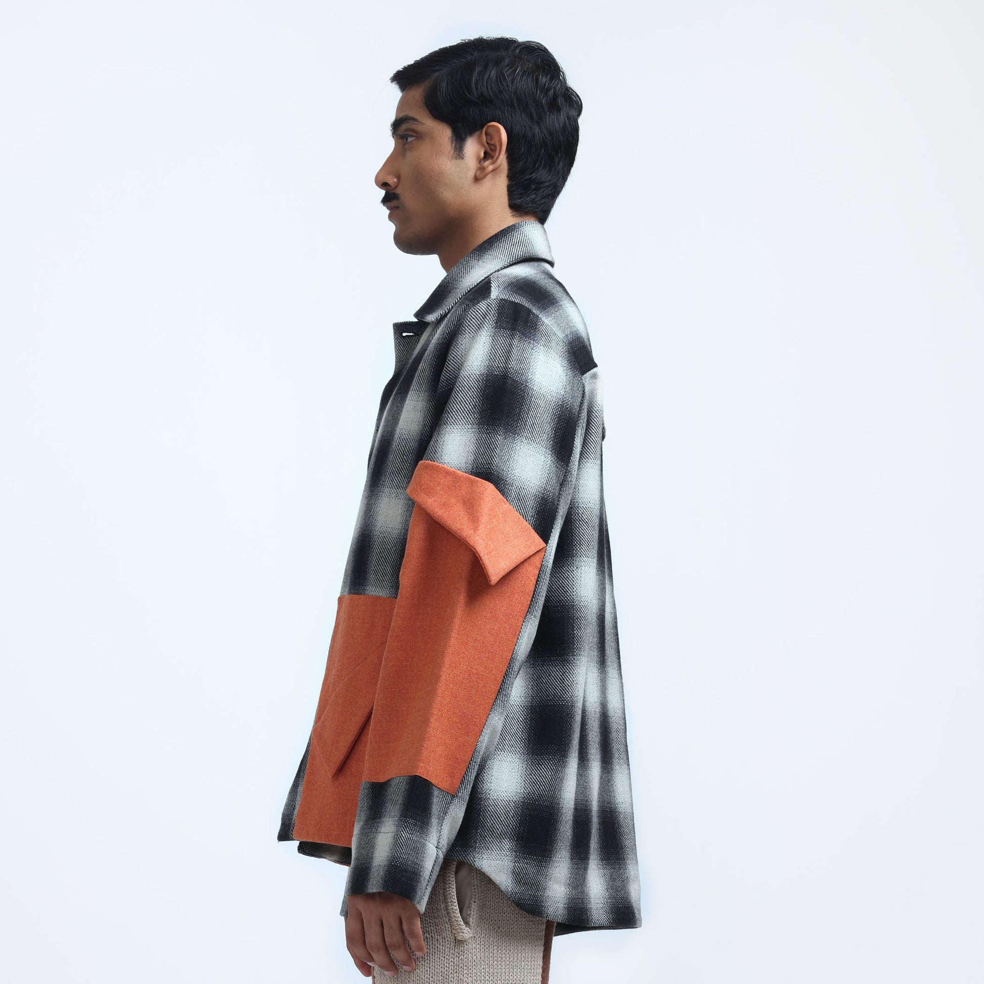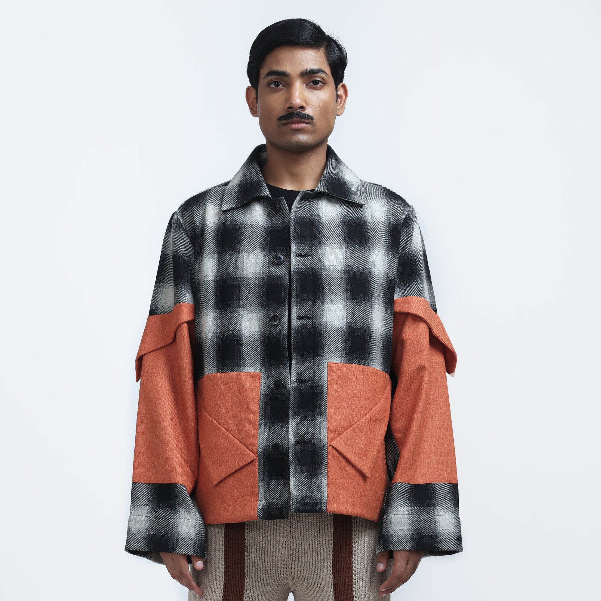 Merino wool jacket with inseam pockets and patch pockets in front, Patch pocket with origami fold, Applique in sleeves with orgami fold, Corozo buttons.Fabric:Shell- Merino Wool blend, Lining- Bemberg