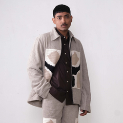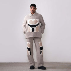 Natural dyed organic cotton terry jacket and trouser with hand crocheted applique, Gaji silk lining.