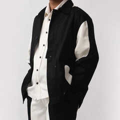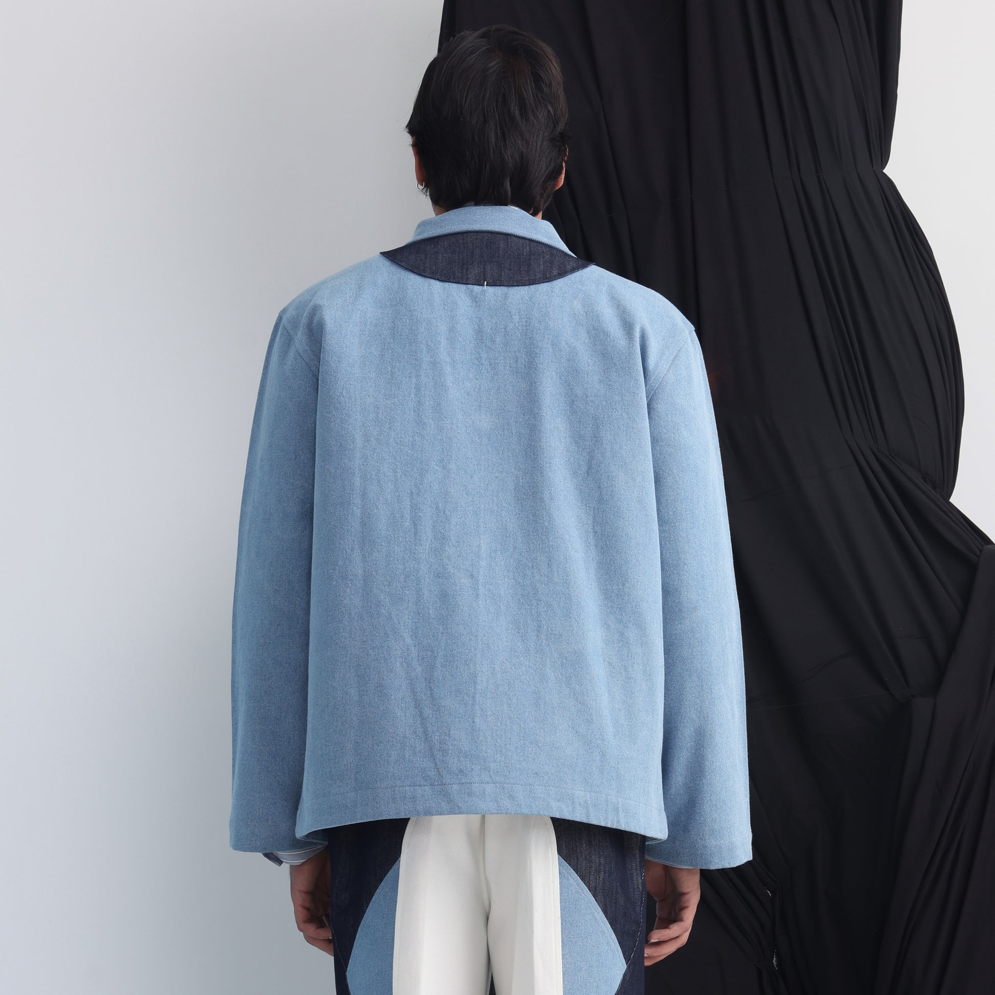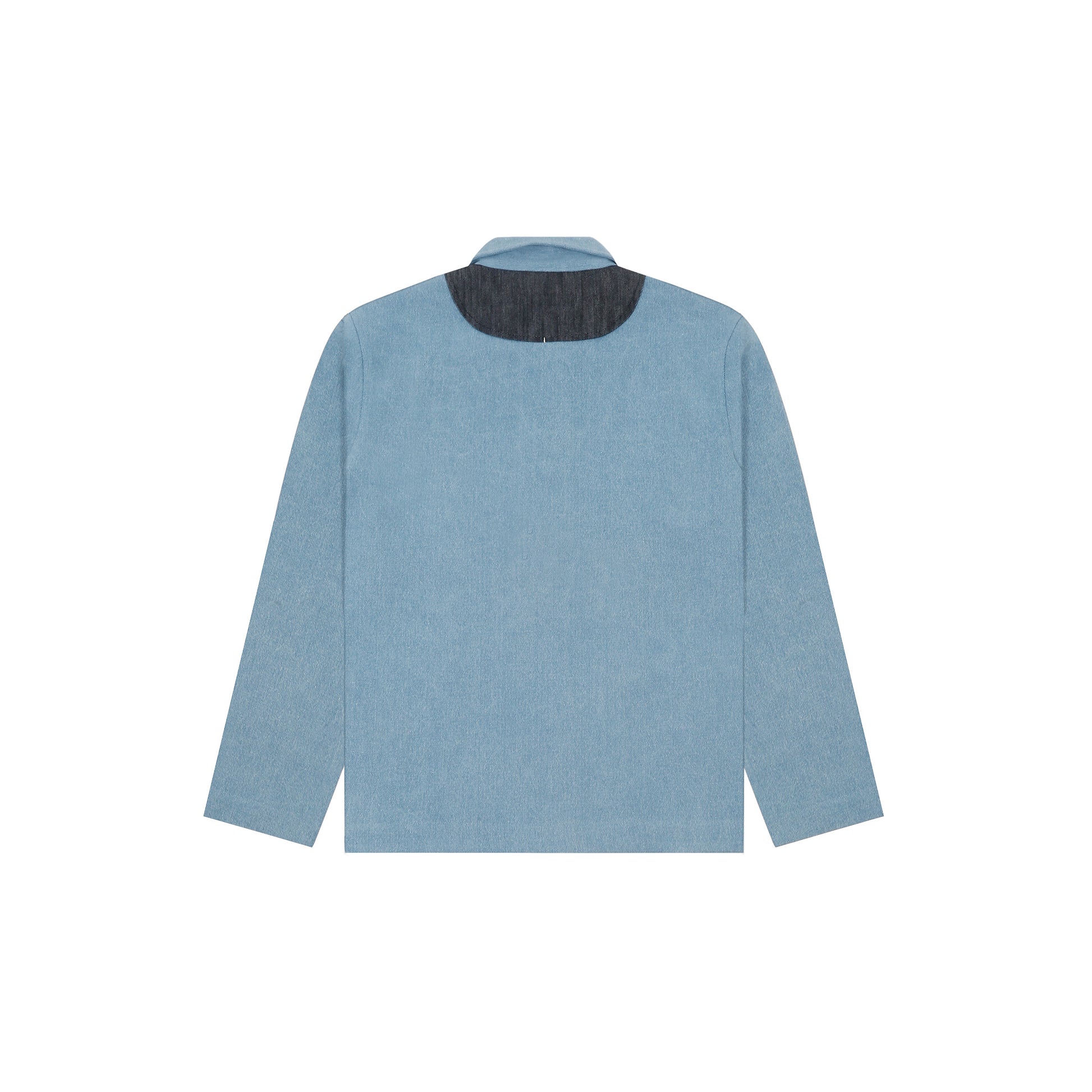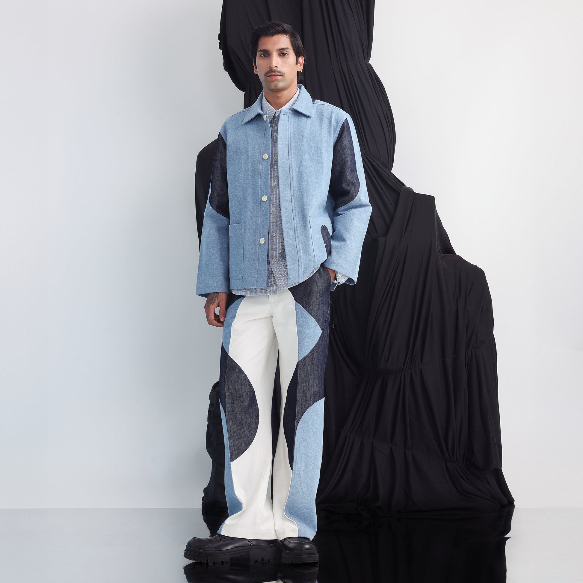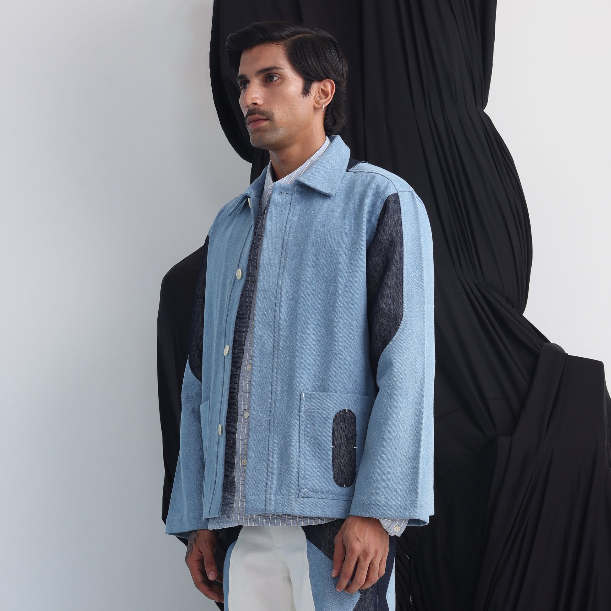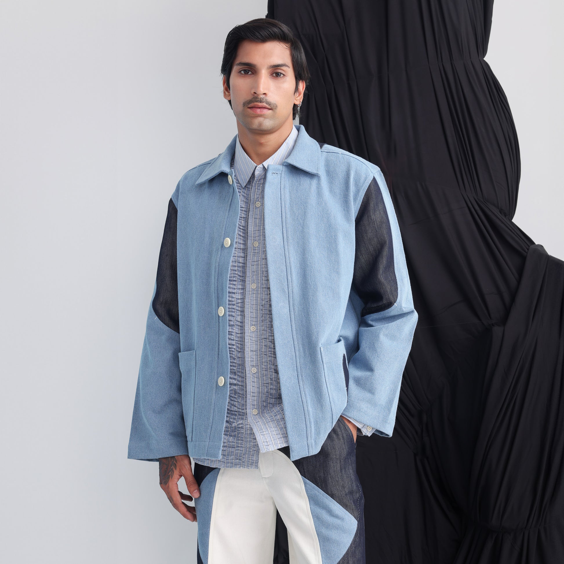 Our signature Binary Fission Overshirt- 104, crafted in 100% cotton denim, features a relaxed straight fit with color blocking and symbolic sleeve cuts. Front patch pockets come detailed with contrast bar tacks and a Human Symbol patch. Bartack accents appear throughout—quiet signs of craft on a best-selling silhouette.