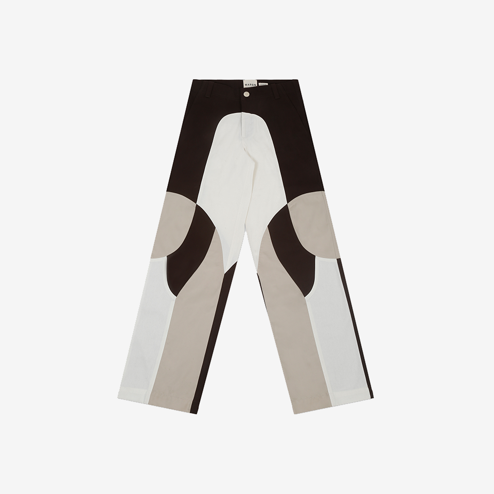 Panelled construction, Top stitch on panels, Corozo button, Continuous waistband, Slant pockets.