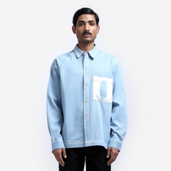 Symbolic patch pocket with Human symbol, Raglan sleeve on one side and regular sleeve on other, Contrast flatlock stitch, Full sleeves.
