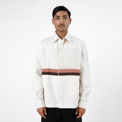 Crafted from handwoven 6 oz lightweight twill, this shirt features a tonal crochet applique made in collaboration with our all-women team in the northern Himalayas. The crochet, designed in three colors reminiscent of a tri-color flag, adds a subtle yet meaningful touch. Finished with a concealed placket, Corozo buttons, and a relaxed classic fit.