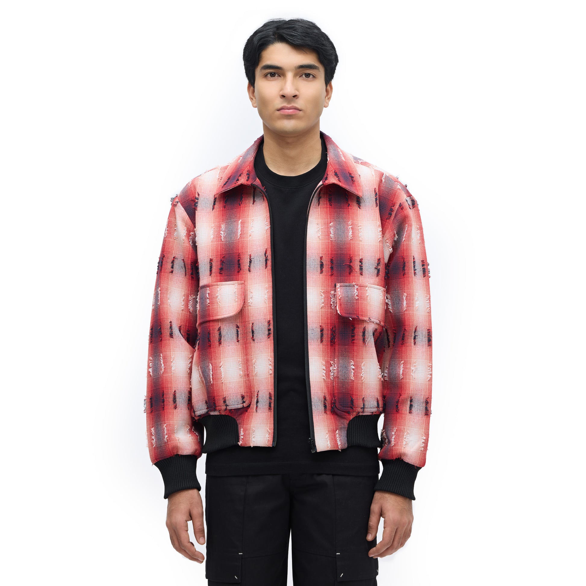 Crafted in our signature Medullary flannel with extra-weft detailing, this jacket brings depth to a classic check. It features a cropped, relaxed silhouette with a front zipper, oversized waist patch pockets with side entry, and an inside patch pocket. Finished with signature Margn cuts, it pairs effortlessly with solid silhouettes, letting the checks break the form.