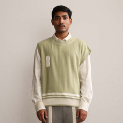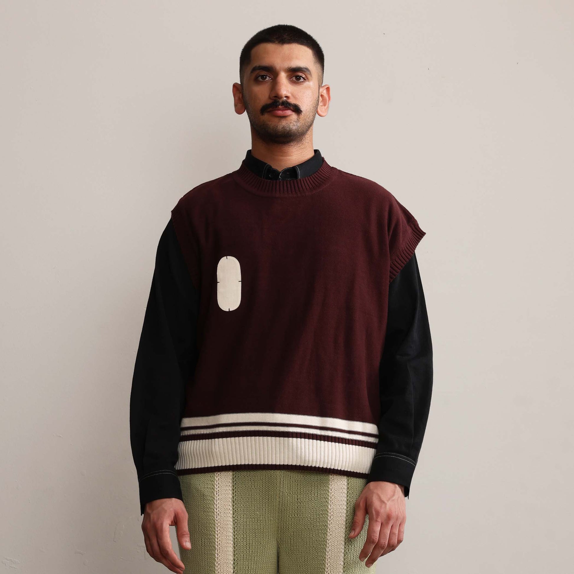 Hand-knitted on Flat-bed loom, Human symbol applique in front with hand tacks, Asymmetric shoulders.