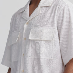 Camp collar shirt, Handtack details in shirt and shorts, Half-sleeve, Corozo buttons, Hand-knitted cotton tape in pista green at back yoke, Shorts with human symbol patch, Drawstring in waistband.