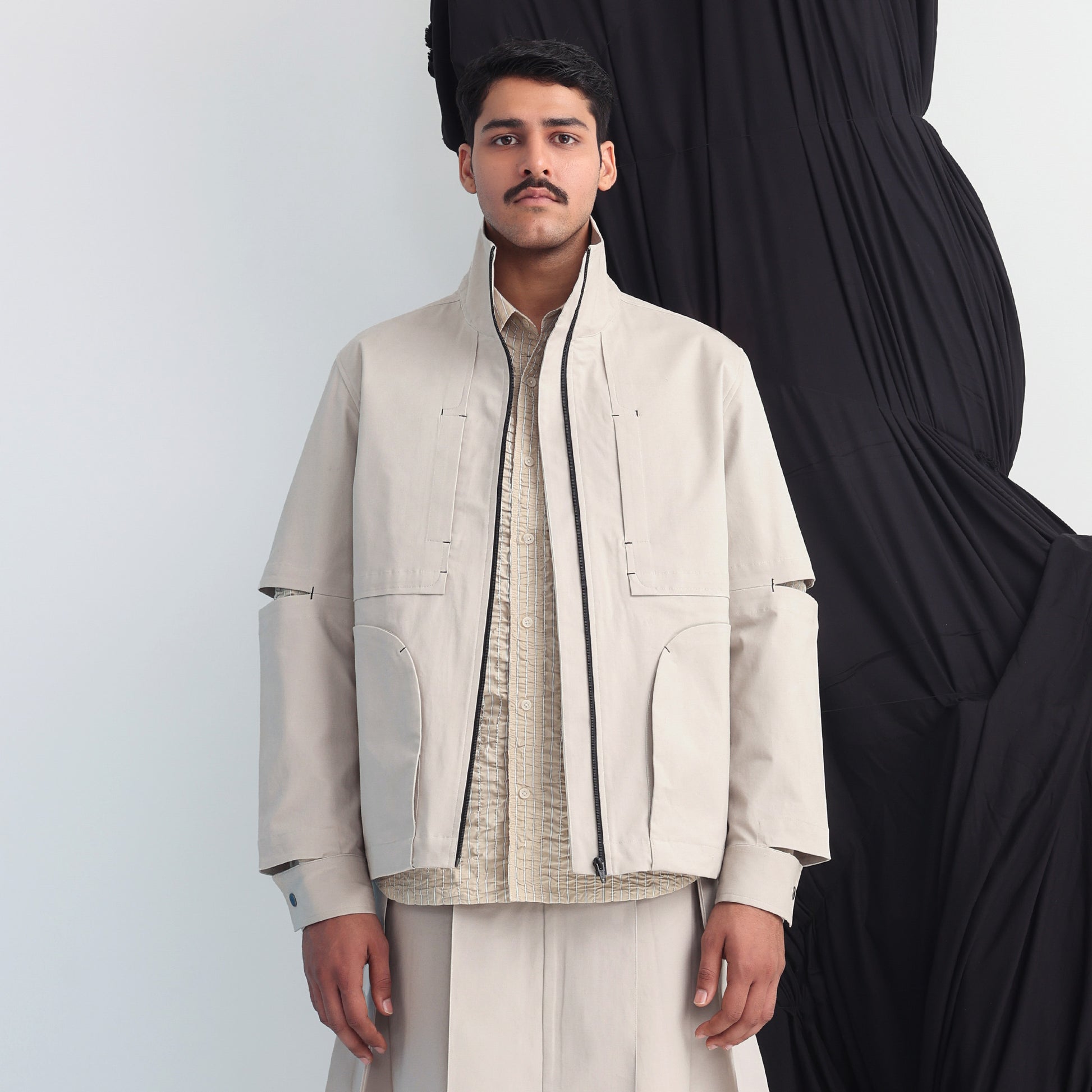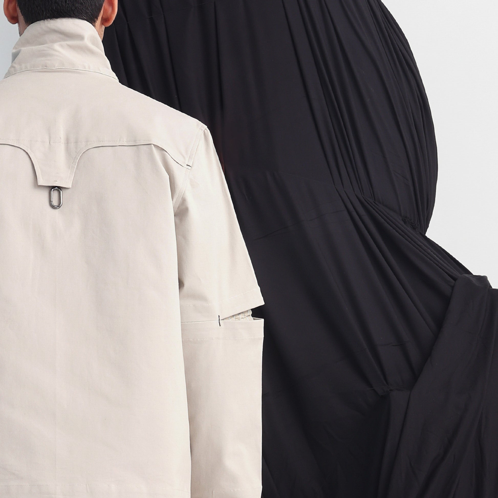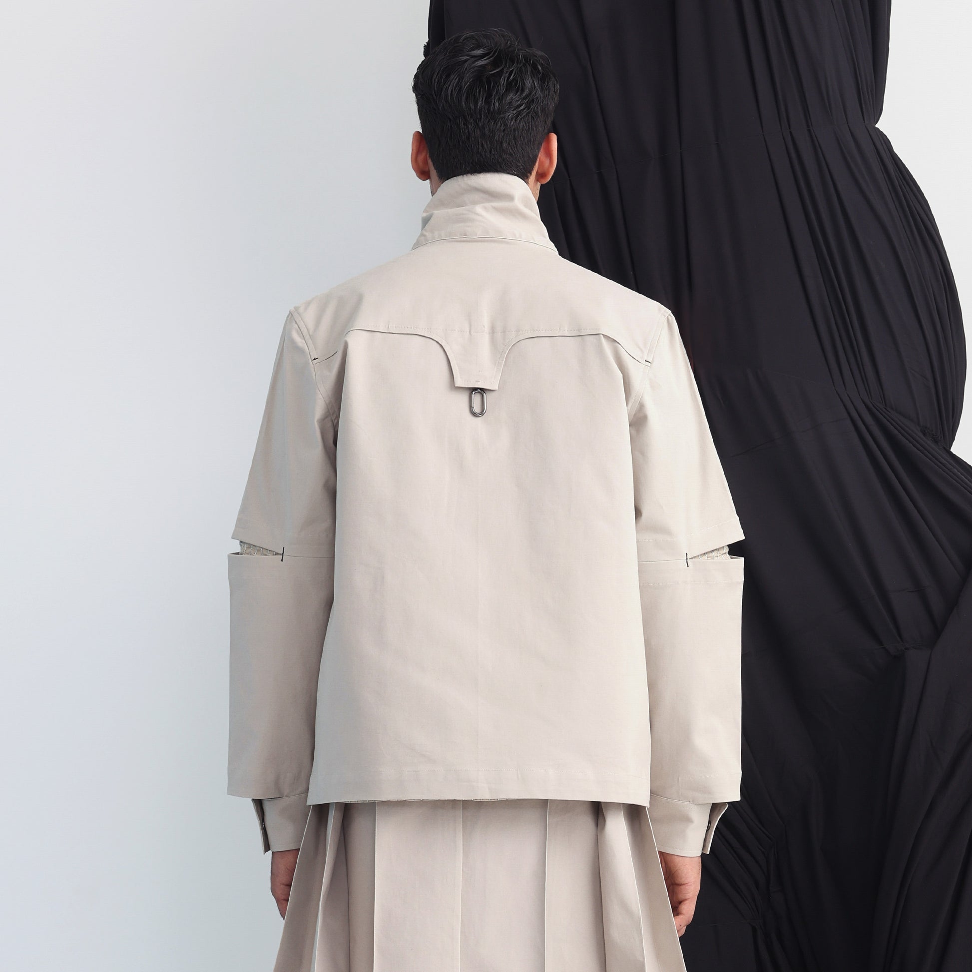 Concealed chest pockets with a flap, Gusset patch pocket on sides, Bartack details, Human symbol metal hook at back yoke, Cut out detail at elbow, Signature cut-out cuff detail, Bartack details, Lined in front.