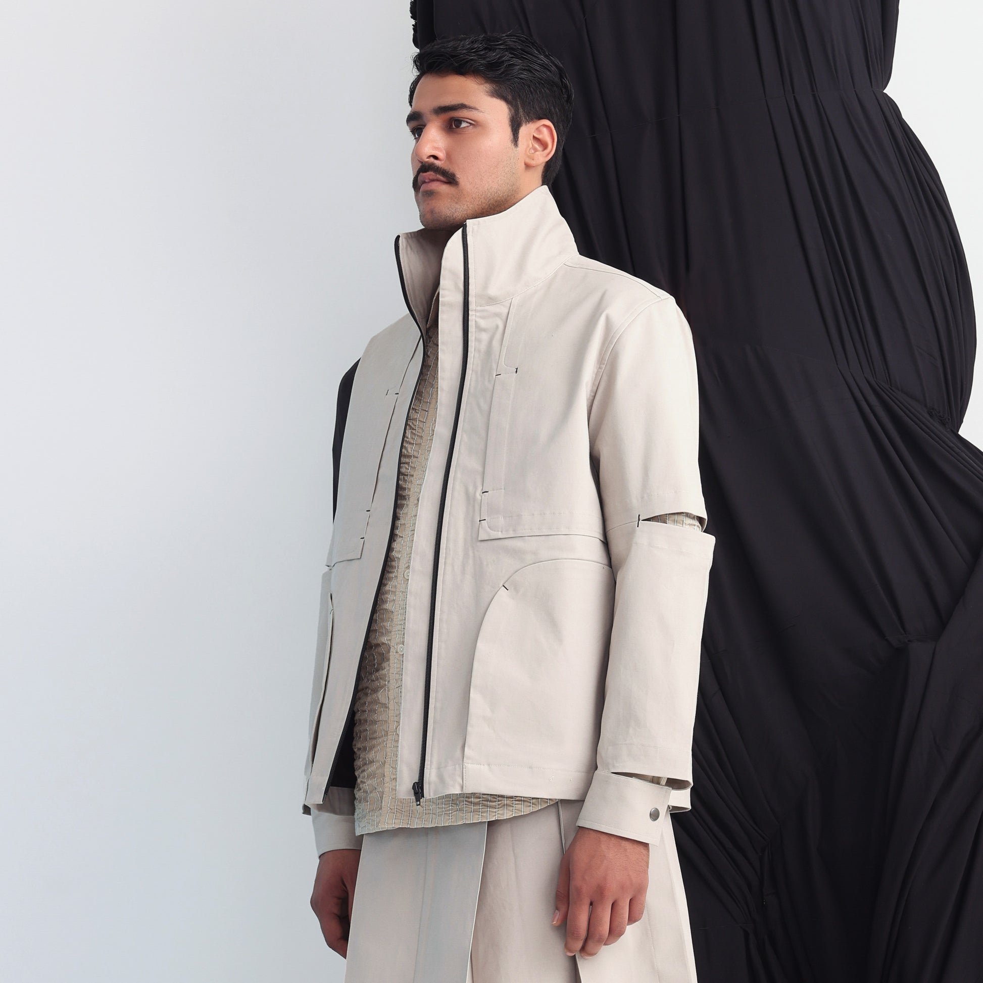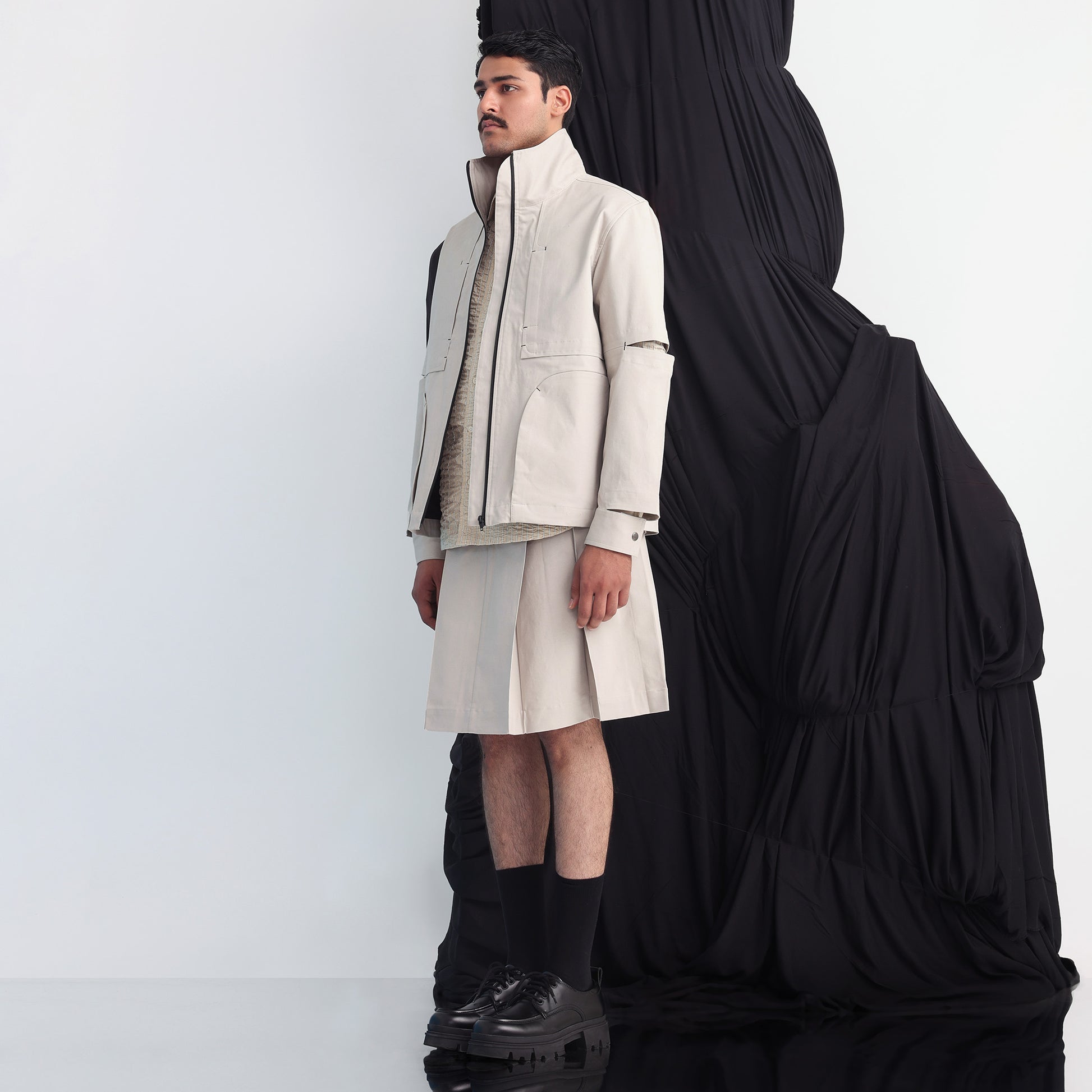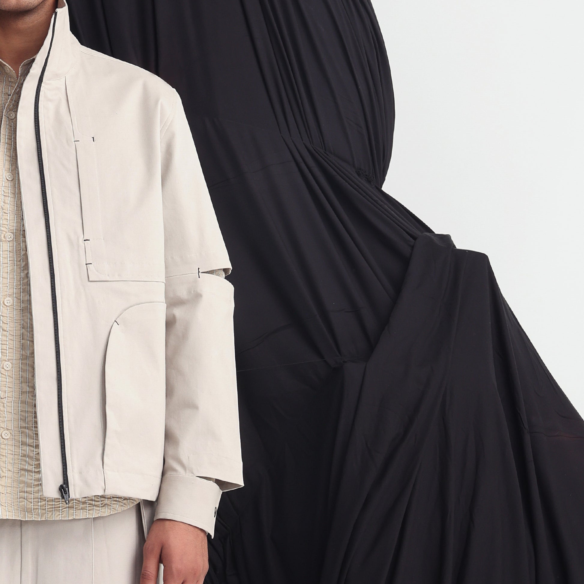 Concealed chest pockets with a flap, Gusset patch pocket on sides, Bartack details, Human symbol metal hook at back yoke, Cut out detail at elbow, Signature cut-out cuff detail, Bartack details, Lined in front.