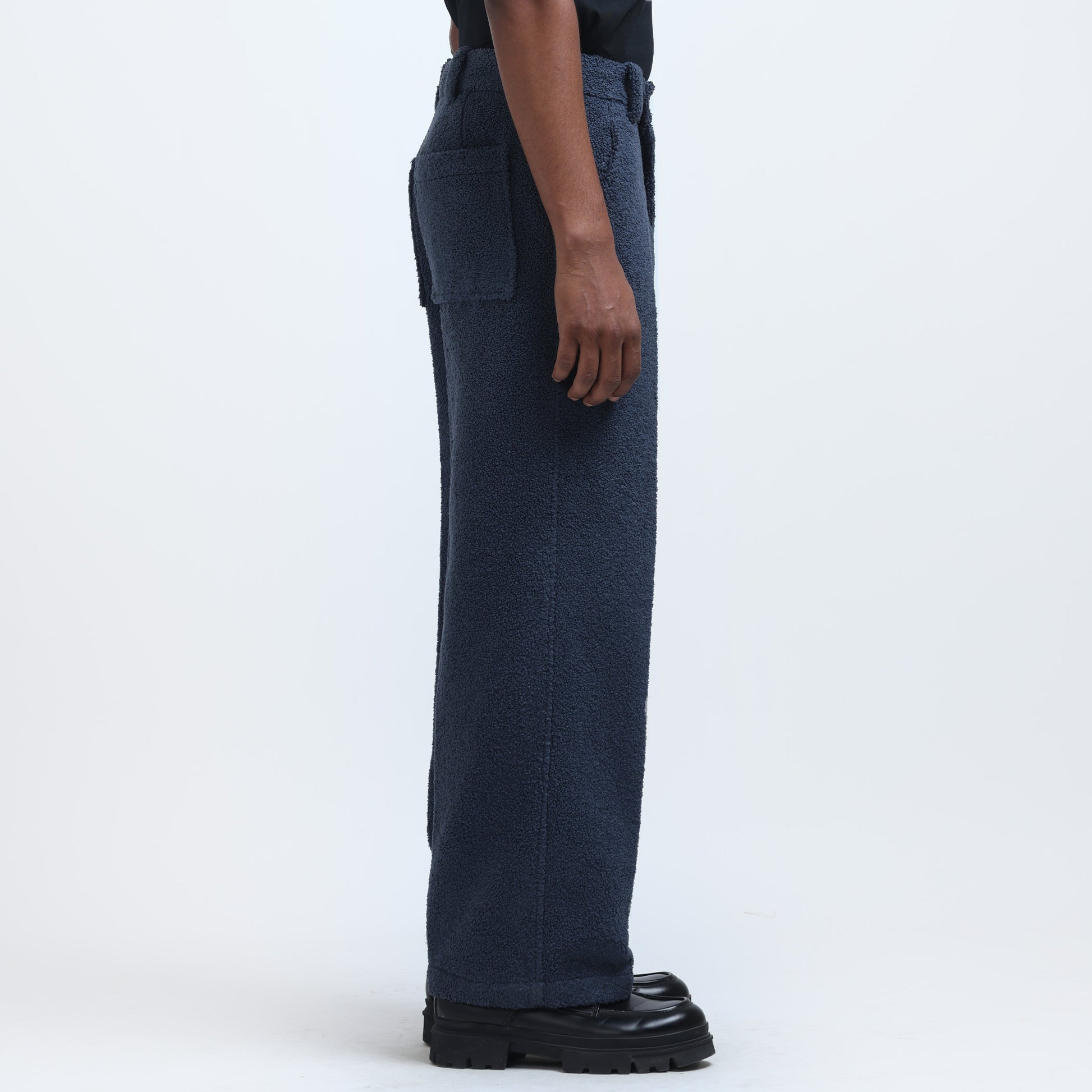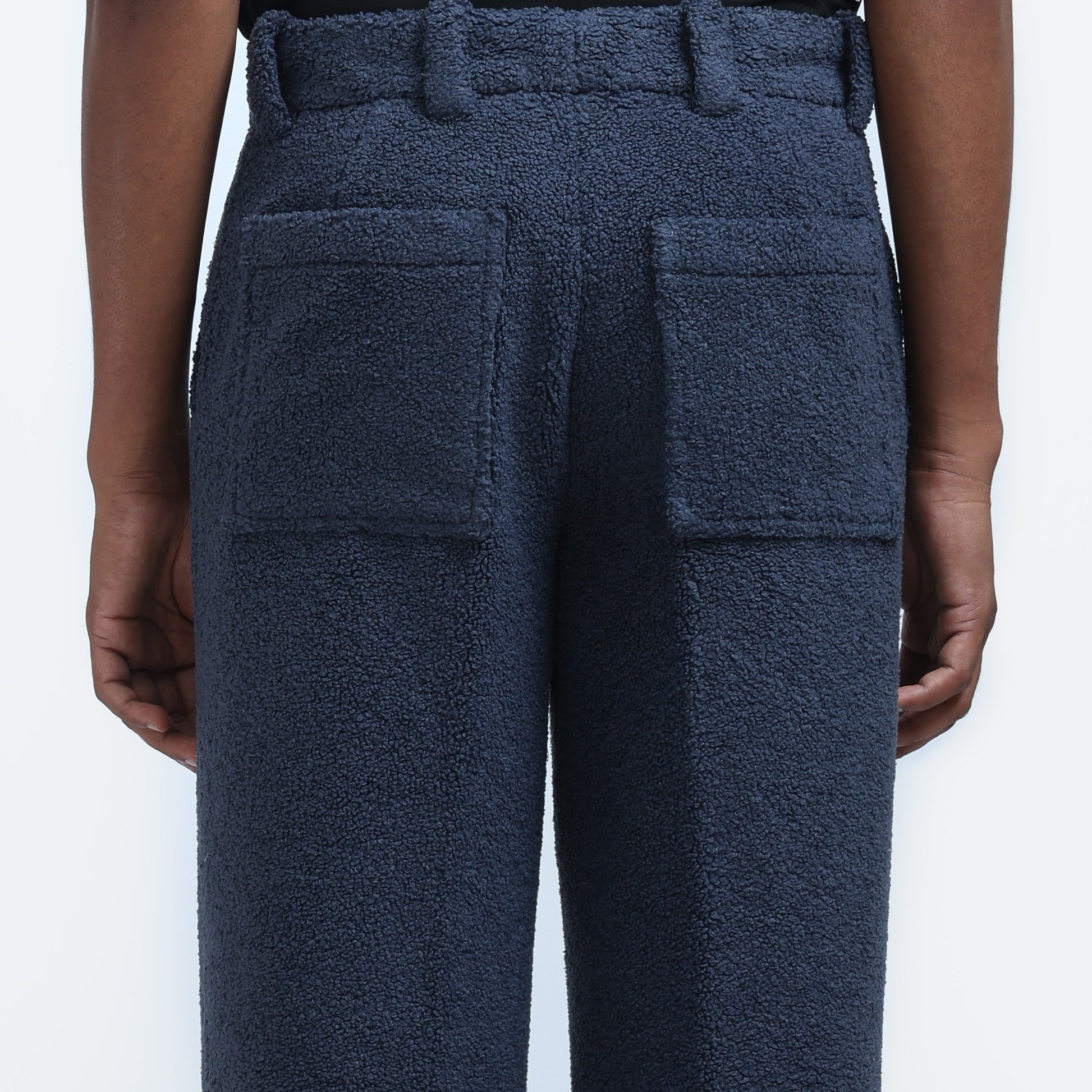 Elevate your wardrobe with these textured boucle trousers, featuring a signature cut at the waist and fly zip. Designed with a relaxed fit silhouette, they offer both comfort and style. The unique texture adds a refined touch to your everyday essentials. Pair them easily with your essential tops for a sophisticated, clean look.