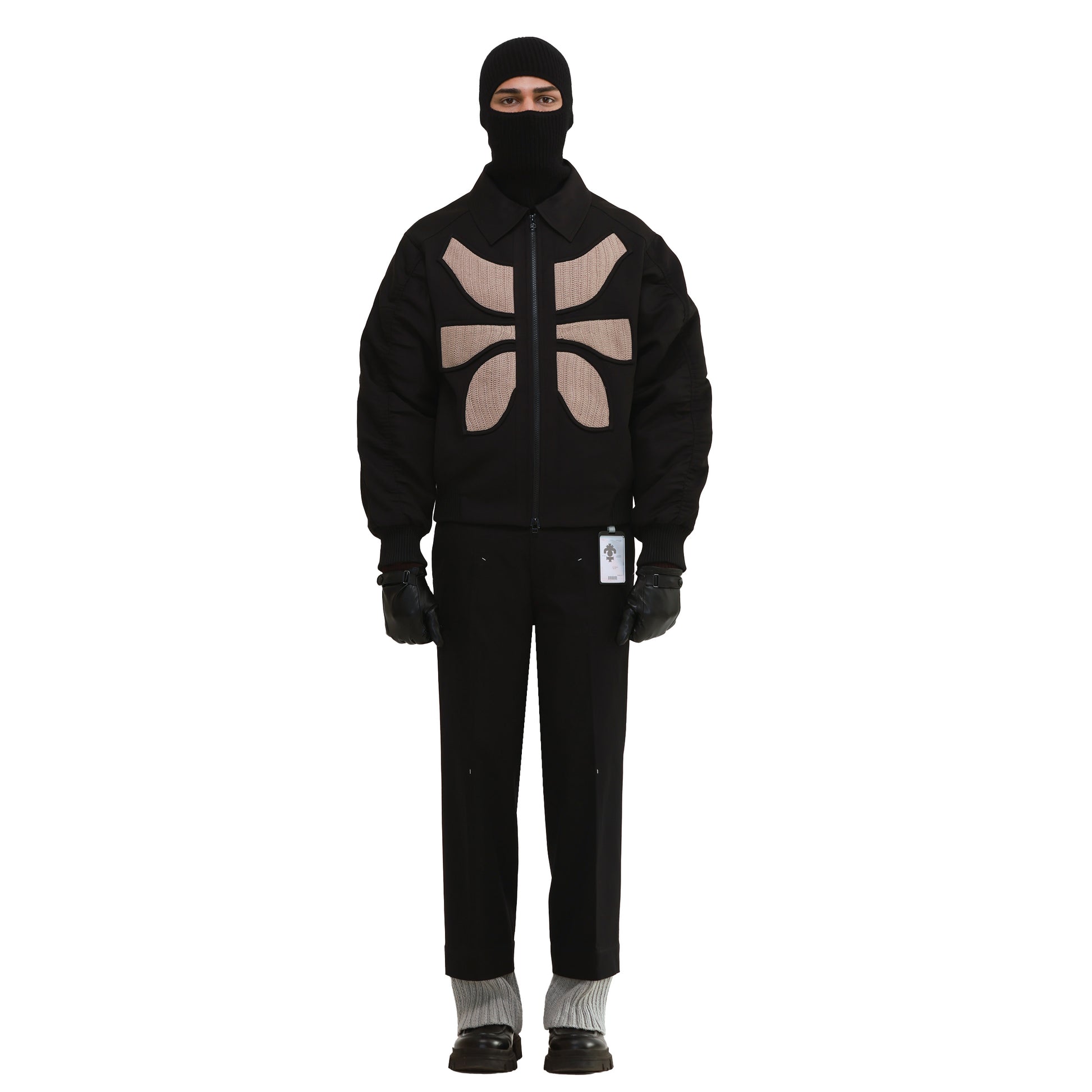 Our iconic Vertebrae's finds new form in this cropped bomber jacket, featuring a relaxed silhouette, wrinkle-detailed sleeves, and hand-crocheted applique at the back. Crafted in heavy poly-viscose with ribbed finishes and quilted taffeta-lined sleeves, it’s designed for both structure and movement. Style it effortlessly with denim for a casual look, or pair it with black pleated trousers for a formal setting. A symbolic jacket that brings together our core pillars—craft, functionality, and symbolism.