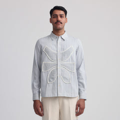 Hand crocheted symbolic applique work finished with binding, Full Sleeves, Oxford Collar, Corozo buttons.